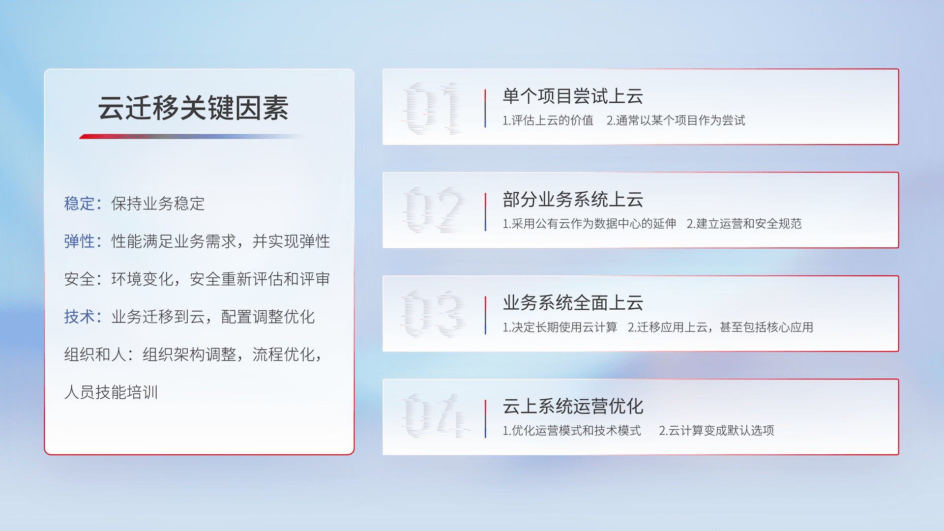 结合实际业务,,从规划设计、、云平台选型、、、云原生改造、、、数据迁移、、集成交付,,,,迁移全过程为客户识别最佳上云路径,,,做好风险识别管理,,设计网络架构、、身份权限、、、安全审计合规、、、、操作审计、、、日志审计、、、、监控告警策略、、、、多站点容灾设计等,,,对云上基础设施进行整体规划,,,,提升IT治理水平,,,以满足弹性、、、、高可用、、、高性能的需求。。。。